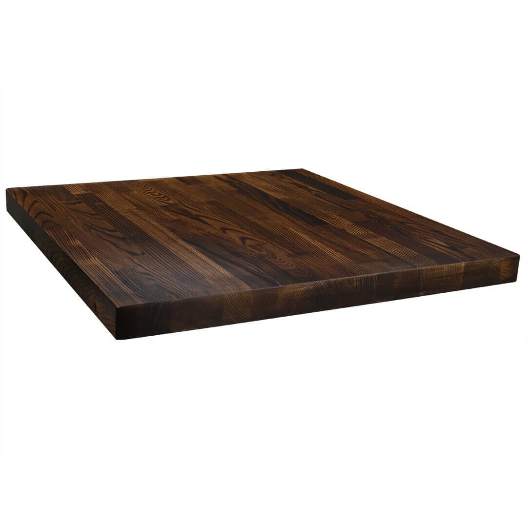 Similar to our butcher block tables, these table tops are made by taking 2” thick ash wood pieces and gluing them together with commercial adhesive. After these tables are put together, they are purposely burned in an oven. This burning gives the tables a charred, rich brown color and strengthens the material by caramelizing the sugars in the wood. Through this heat-treating, the wood becomes less likely to crack or warp. After the oven, the tables are sanded and top coated.